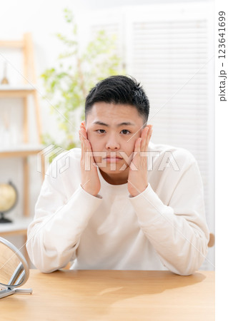 頬を触る男性 笑顔