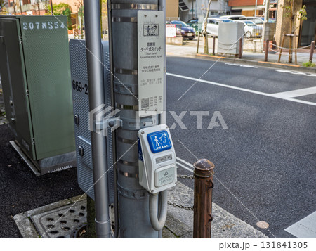視覚障害者用音響式信号機のスイッチと横断歩道