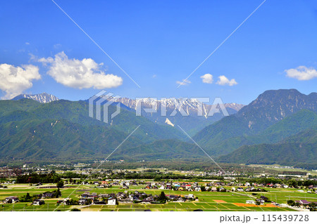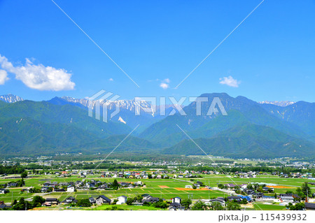 高台から望む、冬の北アルプスと安曇野の町並み 安曇野平