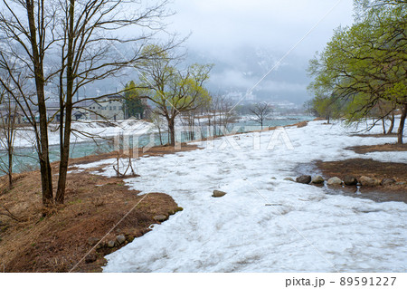 雪どけの魚野川 千曲川支流 越後湯沢 関越自動車道湯沢IC付近 残雪 早春の風景