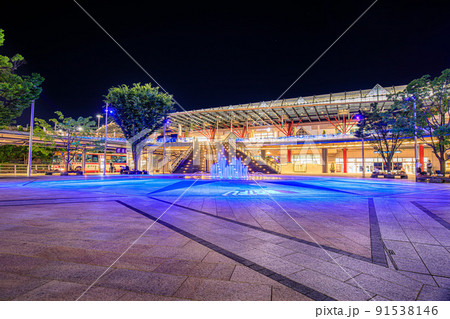 岐阜市 夜の岐阜駅前広場と岐阜駅舎