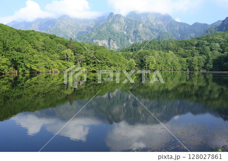 初夏、戸隠高原の鏡池、湖面に映った戸隠連峰
