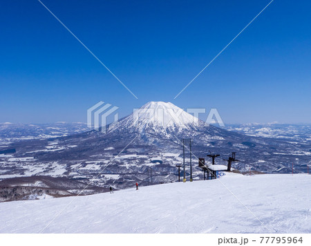 快晴のスキー場から斜面と羊蹄山を眺める (ニセコ、北海道)