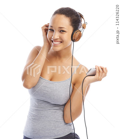 Happy woman, portrait and headphones listening to podcast for audio streaming against a white studio background. Female person smile enjoying sound track, music or playlist on smartphone with headset