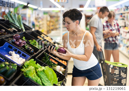 Portrait of cheerful female buyer taking fresh eggplant on supermarket