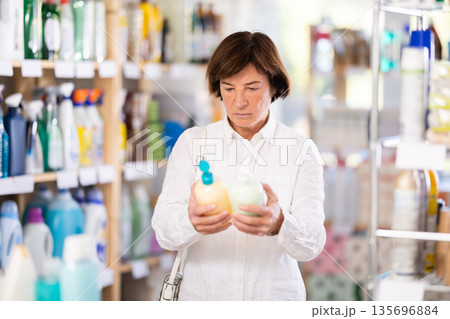 Female buyer chooses liquid hand soap in household goods department of supermarket