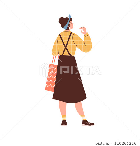 Girl wearing skirt, blouse and head scarf carrying paper bag.