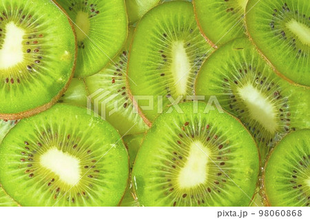 Close-up view of the green kiwi fruit slices in water background. Texture of cooling fruit drink with macro bubbles on the glass wall. Flat design. Horizontal image