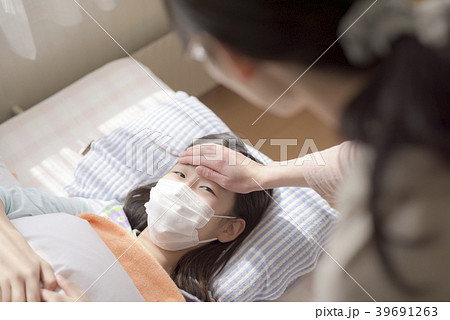 体調不良の子供の熱を測る母親