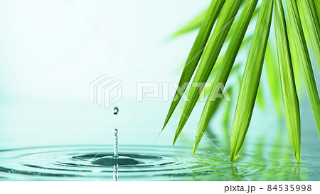 fresh green leaves with water drops over the water , relaxation with water ripple drops concept