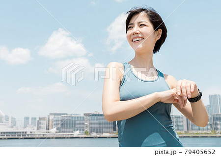 屋外で運動する若い日本人女性