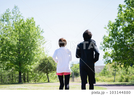 青空の下ランニングするカップル ジョギング、マラソンイメージ