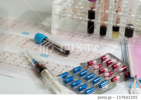 Blood samples test results are organized on lab table in clinical setting