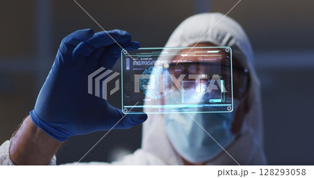 Image of male scientist holding interactive screen with medical data processing