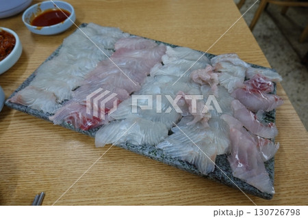 Fresh and delicate gwang-eo hoe (flatfish sashimi) with a clean, tender texture, offering a perfect balance of subtle sweetness and ocean freshness in every elegant, refreshing bite.