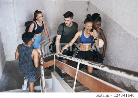Soccer, group and fitness, walking and stairs for cardio, diversity and friends exercise together in healthy and active lifestyle motivation. Young, men and women happy, athlete and sports training.