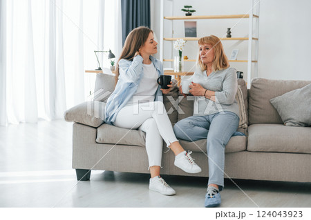 With cup of drinks, having a conversation. Mother and daughter is together at home