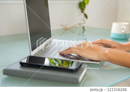 Woman typing on laptop at home, smartphone and coffee cup on glass table