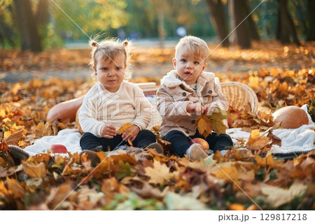 Front view. Two cute little kids are sitting in the park on the autumn fallen leaves and butternut squash
