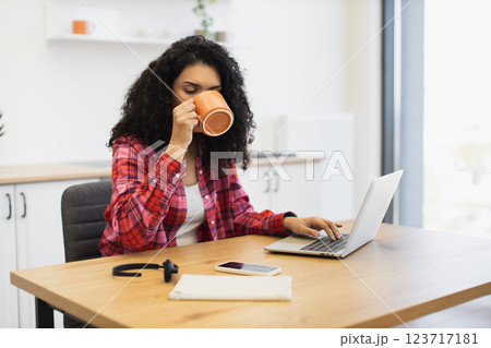 African woman in casual outfit sitting at table, drinking coffee and using laptop in bright, modern living area, creating a cozy and focused atmosphere, depicting remote work or relaxation.