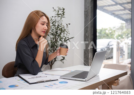 Young Asian businesswoman sitting in modern office, enjoying coffee. Professional attire, relaxed mood with laptop nearby. Concept of work-life balance, productivity.