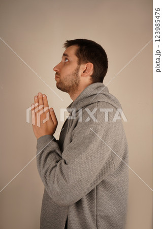 In sporty attire, the young man clasps his hands together, creating a prayer-like gesture. His eyes are focused, suggesting a moment of hope. The pose expresses sincerity and devotion.