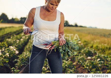 Holding beetroot in hand. Woman is on the agricultural field at daytime