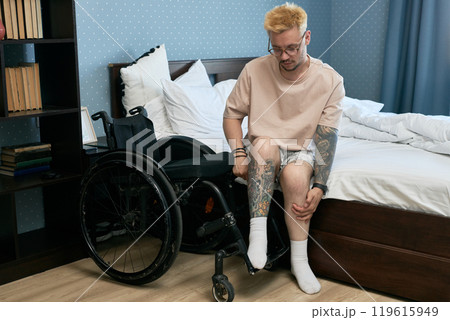 Young man in casual attire stretching and sitting beside wheelchair in a cozy bedroom setting with a bookshelf and comfortable bed in the background