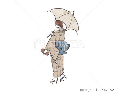 日傘を持って歩く着物姿の女性(背景ベージュ)