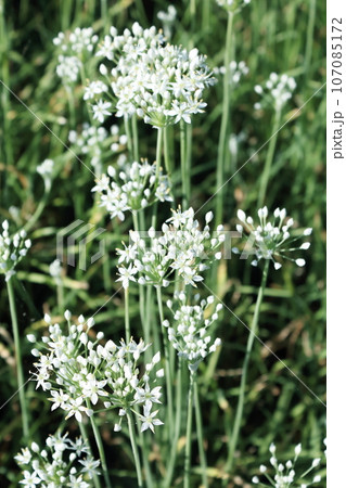 白い可憐な花を咲かせるニラが畦道に群生していている