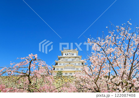 関西・姫路・姫路城・備前丸跡の広場、満開の桜から飛翔する白鷺のような美しい姫路城・兵庫県姫路市(1)