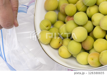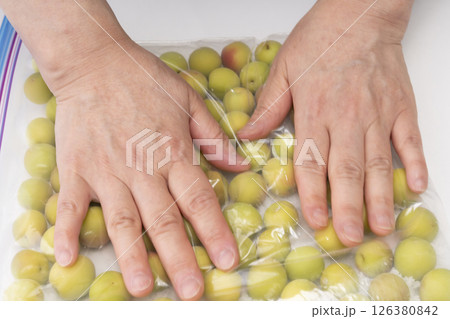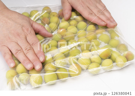 小梅でカリカリ梅を作る工程 ジッパー付き袋に下処理した小梅と塩を入れて手で転がす