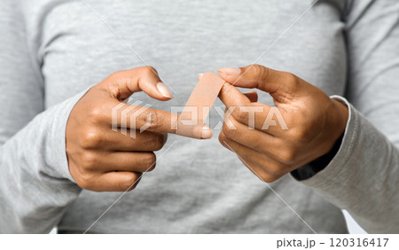 Black woman using adhesive tape on injured finger, self-treatment after trauma, close up