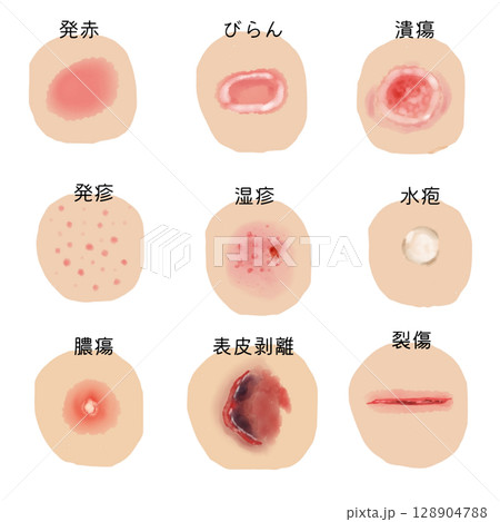 【医療イラスト】皮膚の状態・症状一覧(発赤・びらん・潰瘍など9種)/教育・看護教材向け