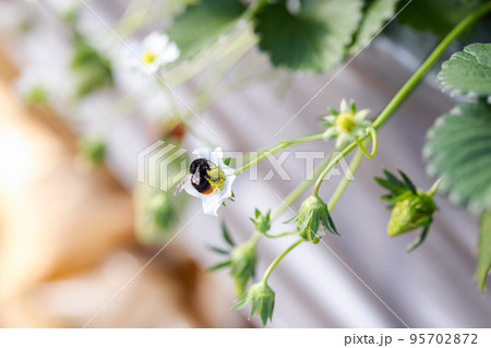 いちごの受粉を手伝うクロマルハナバチ(べにほっぺ・2月)