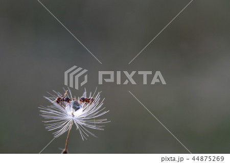 綿毛の上で水滴を囲む2匹のアリ