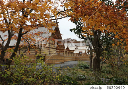 三重県明和町 復元されたさいくう平安の杜の三棟の建物と秋空