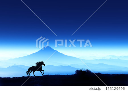 富士山の夜明けと馬のシルエット,午年イメージ