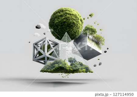 Surreal geometric design featuring triangular shape with green mossy sphere and tree, symbolizing nature and harmony