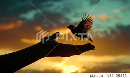 夕暮れの空へ飛び立つ鳥と手のシルエット