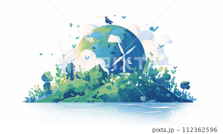Renewable energy illustration featuring wind turbines, solar panels, and energy storage solutions, surrounded by trees and clouds, symbolizing sustainable development and eco-friendly technology