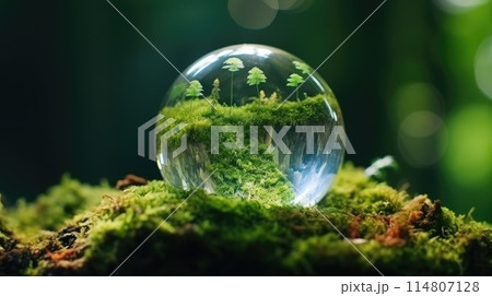 Eco-Consciousness. Crystal Globe Resting in Mossy Ambiance. ESG Symbol. Crystal Globe Displayed on