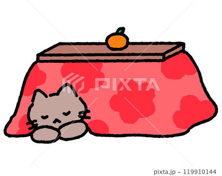 猫がこたつで丸くなっている手描きイラスト