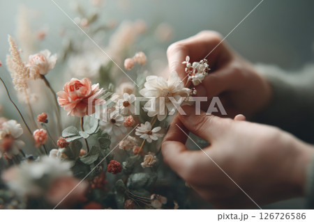 A gentle hand arranging beautiful flowers capturing the essence of nature and artistry in an indoor space.