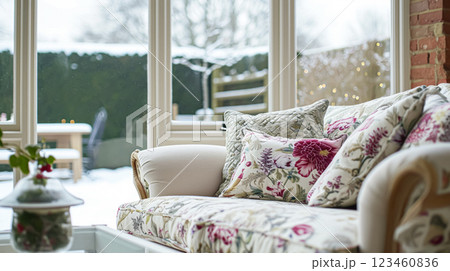 Colorful pillows on sofa against glass wall of window in a winter garden or conservatory. Interior textile concept. High quality photo