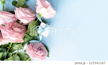 Delicate pink roses in full bloom on a branch with soft green leaves against a pastel background