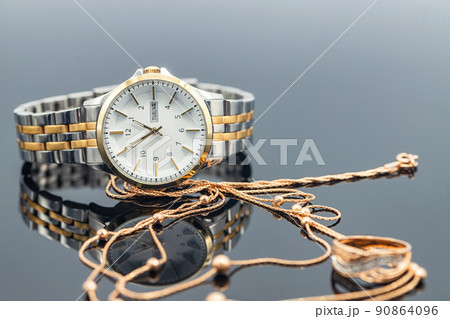 Accessories and jewelry for a fashionable girl : gold ring, necklace and original wristwatch