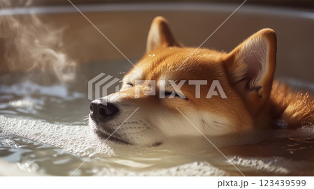 お風呂でくつろぐ柴犬 – 湯船の中の幸せな表..