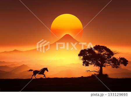 富士山の日の出と馬のシルエット,午年イメージ