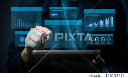 Futuristic virtual dashboard tracking economic trends and financial growth. Business graph and chart intelligence dashboard displaying data analytics. Digital transformation technology